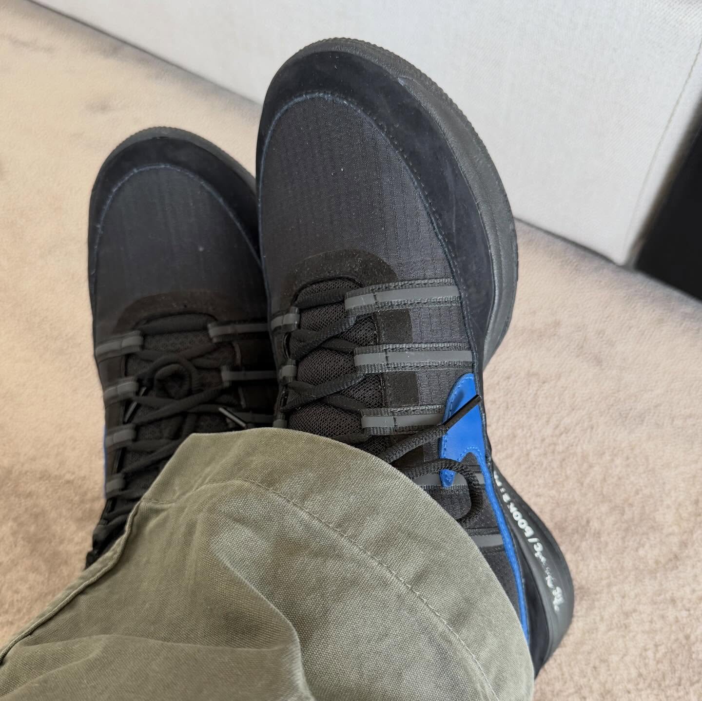 スウッシュはホワイト&ブルーの左右非対称カラーを取り入れ、シュータンラベルやヒールサイドにサンダーモチーフ、ミッドソールにはデザインコードが刻まれている。