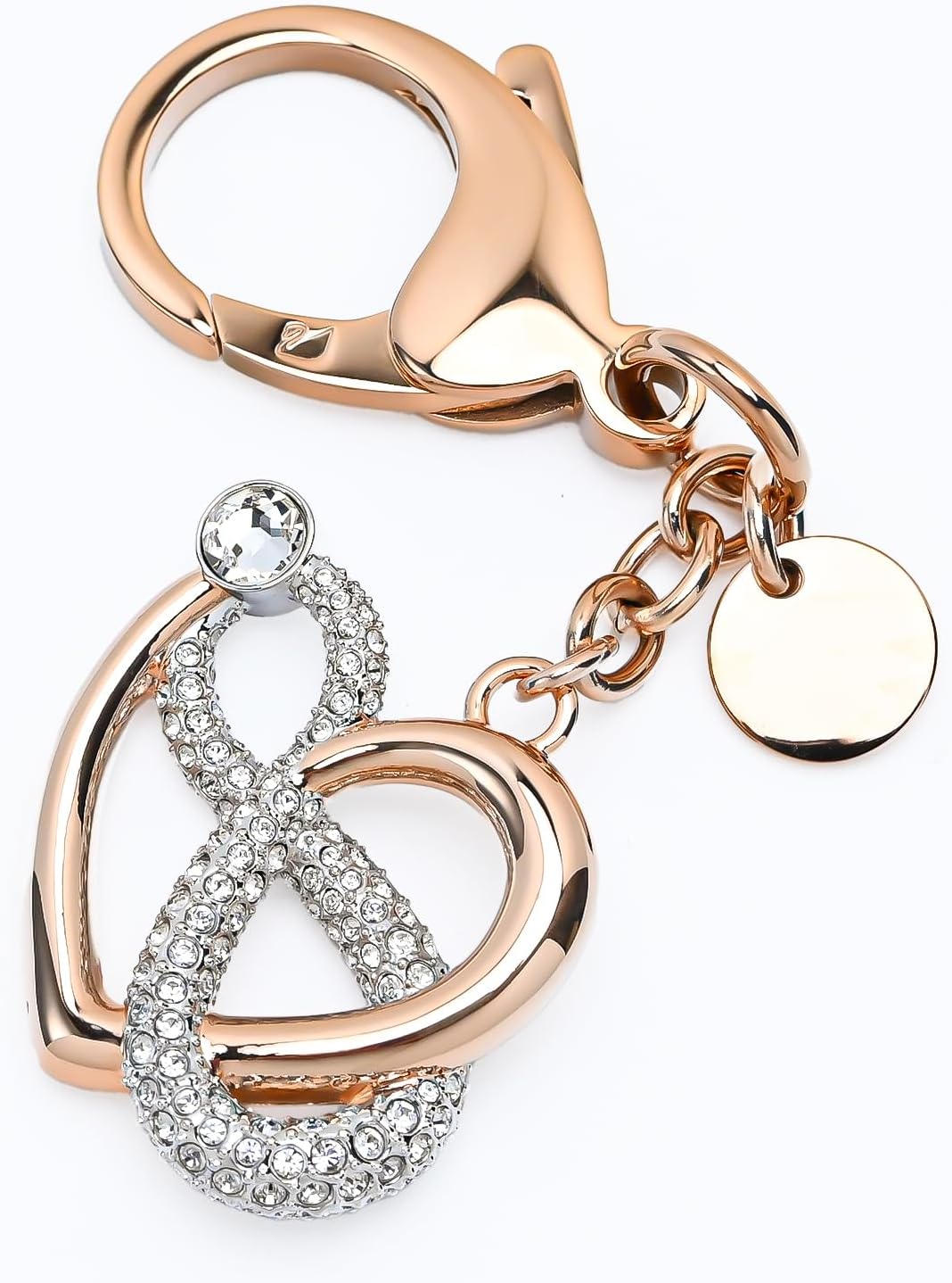 永遠の愛の芸術。スワロフスキーのこのロマンチックなバッグチャームは、ローズゴールドトーンメッキのハートとロジウムメッキの無限大のシンボルを巧みに組み合わせたものです。表情豊かなデザインには、両方の要素を満たすスポットに輝くスワロフスキー クリスタルがセットされています。ロブスタークラスプを使用したこのアクセサリーは、バッグチャームやキーホルダーとしてもお使いいただけます。特別な人への美しくロマンチックなギフトとしても最適です。