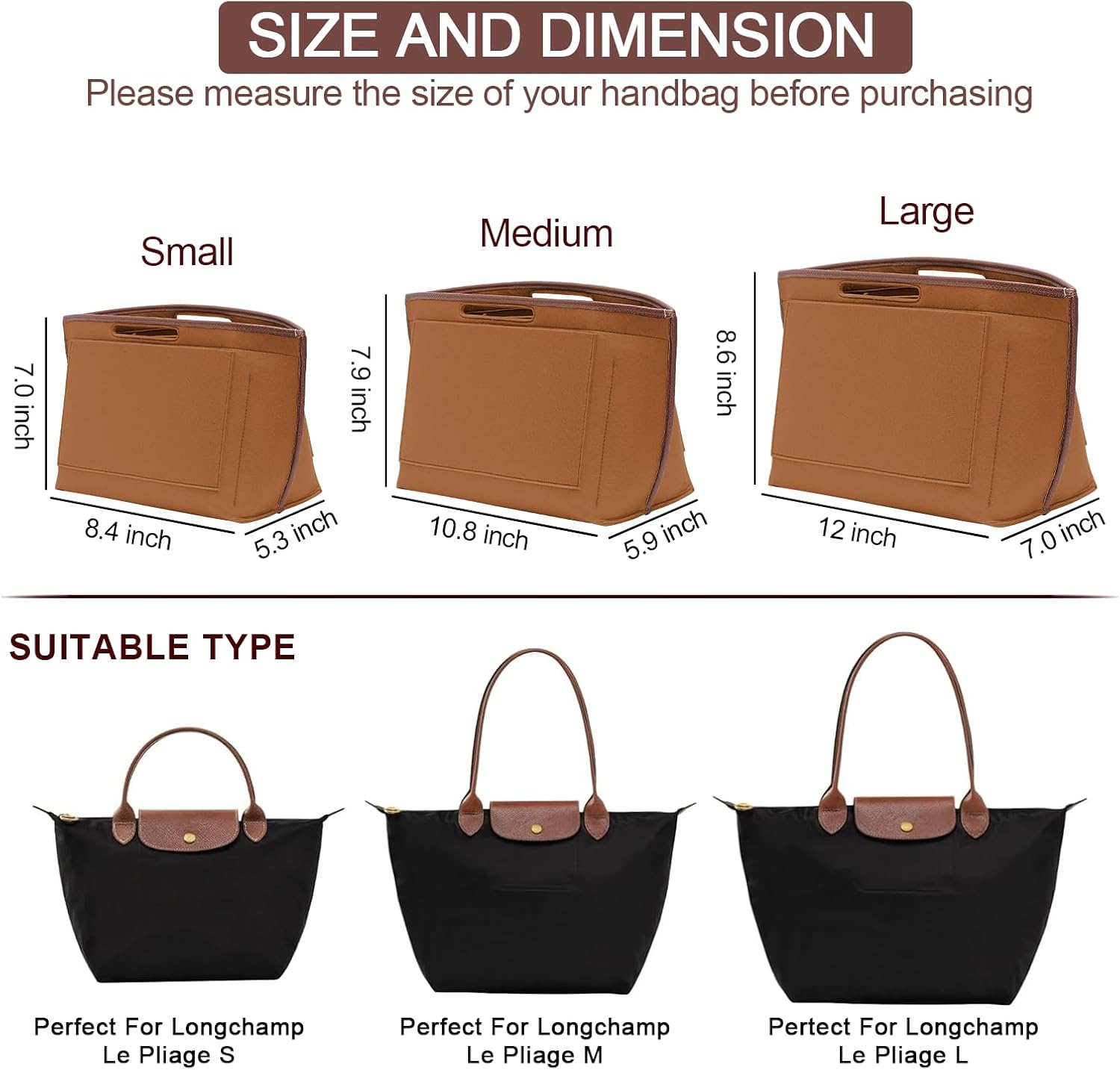 ロンシャン オーガナイザー インサートの寸法: このハンドバッグ オーガナイザー インサートは、ロンシャン ル プリアージュ シリーズおよび同様のサイズのバッグにフィットするように作られています。ご購入前にバッグの内寸をご確認ください。 S: 長さ8.4インチ x 幅5.35インチ x 高さ7インチ 中: 長さ10.8インチ x 幅5.9インチ x 高さ7.9インチ 大: 長さ12インチ x 幅7インチ x 高さ8.6インチ 注: 長さ x 幅 x 高さは長さ x 幅 x 高さです。