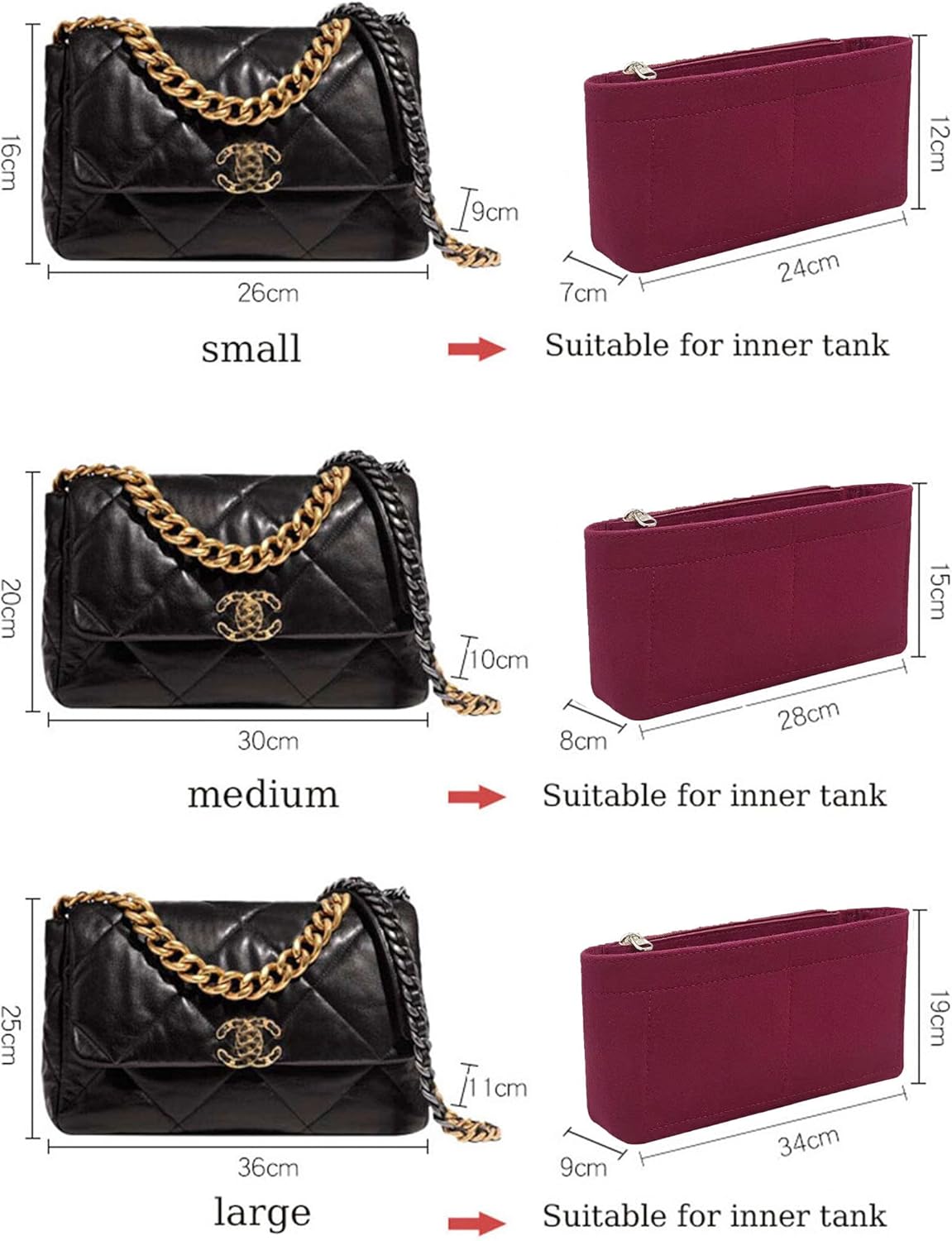 サイズ:シャネル19 ハンドバッグ用に特別に設計:サイズ24×7×12cm = 9.4×2.7×4.7インチ(長さ×幅×高さ)、サイズ27×8×15cm = 10.6×3.1×5.9インチ(長さ×幅×高さ)、サイズ33×9×20.7インチ。 cm = 32 .3 x 3.5 x 7.8インチ(長さ x 幅 x高さ)。
