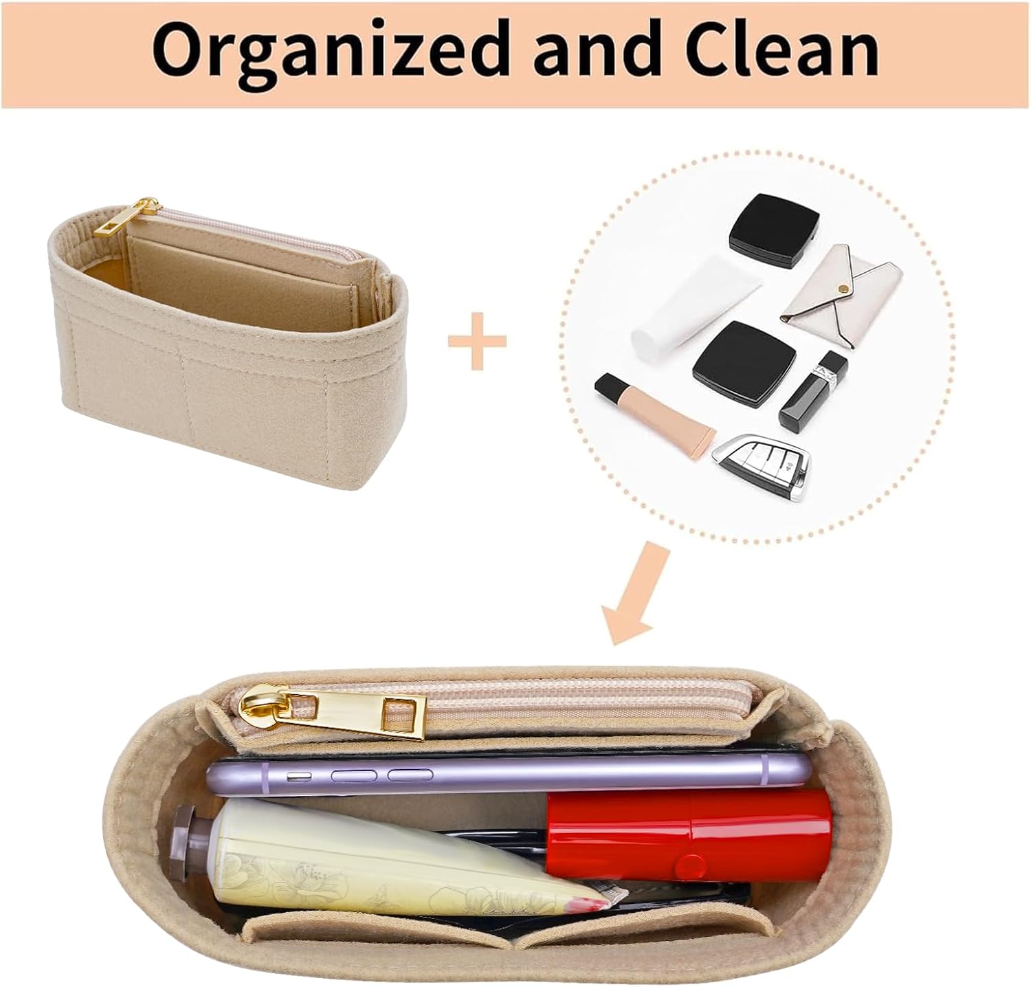 LOUKAYCCI フェルト財布オーガナイザーインサート ロンシャン XS ミニバッグインサート用 (ベージュ、ミニ)