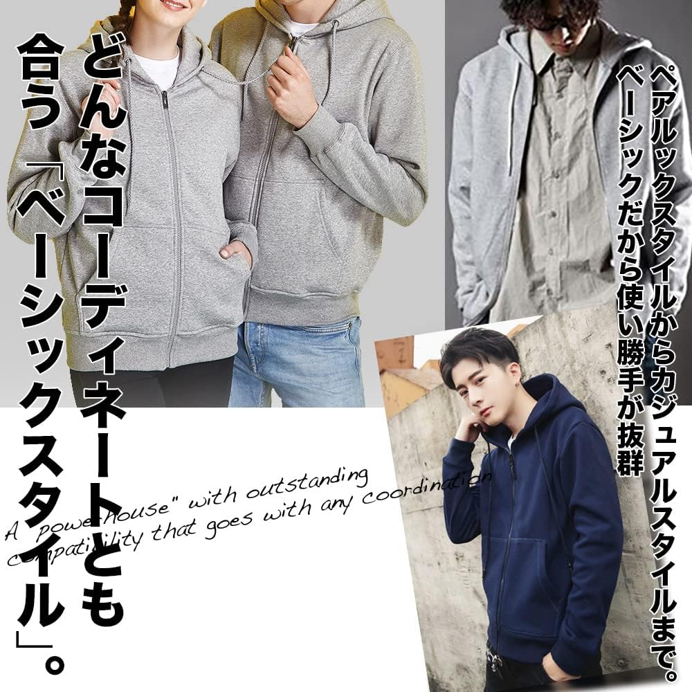 表面素材は柔らかな風合いのコットンです。裏面は暖かな起毛素材で快適な着心地です。秋冬の定番なのでシンプルなデザインで使いやすいです。シンプルなパーカーは男性、女性、親子、カップル、性別、年齢問わず着ていただけます。ジップアップパーカーのメリットは前を開け閉めしなくても雰囲気を変えられることです。バリエーションは無限大です。フードは調節可能です。 ドローストリングが付いているので、寒い時はドローストリングをしっかり締めて防寒対策もできます。また、近年人気のパーカーをタイドアップするなど、ファッショナブルな着こなしも可能です。