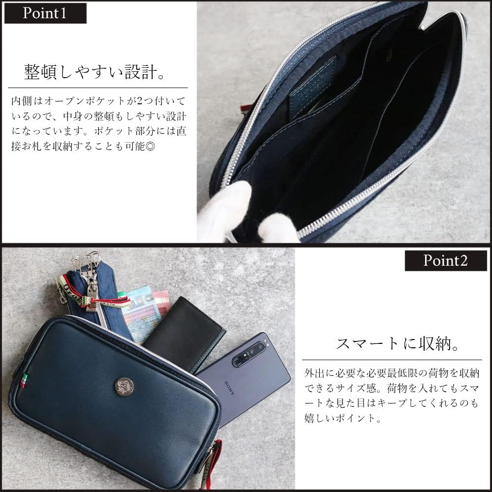 ダ・セーラとはイタリア語で「夜から」を意味します。ファスナーポケットの中に1気室のシンプルなデザインですが、両サイドには仕切りの代わりにオープンポケットを配置し小物の収納に優れており、必需品のスマートな収納を忘れない大人のためのバッグです。
